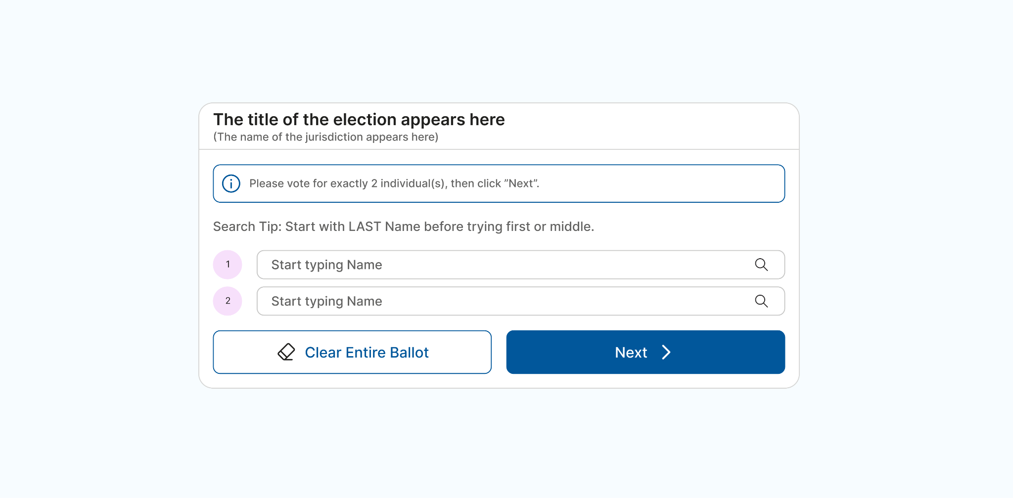 To start voting online, click on the “Vote Online” button. When you see the ballot, start typing the first, middle, or last name of the individual you wish to vote for. As you type, the system displays possible matches with the names of those eligible to serve.