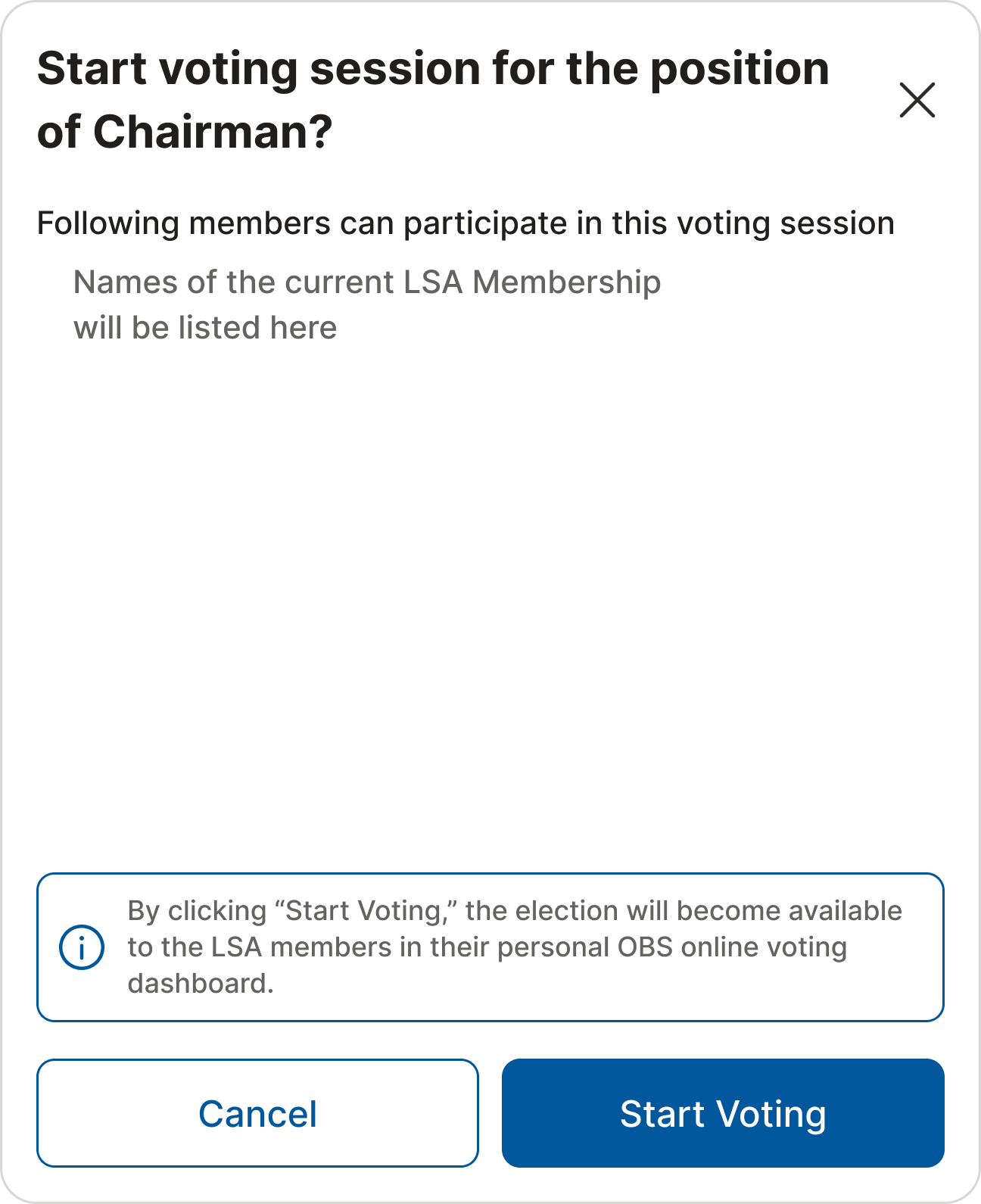 After clicking “Start Voting,” all participating LSA members will be able to see the active officer election in OBS and cast their votes.