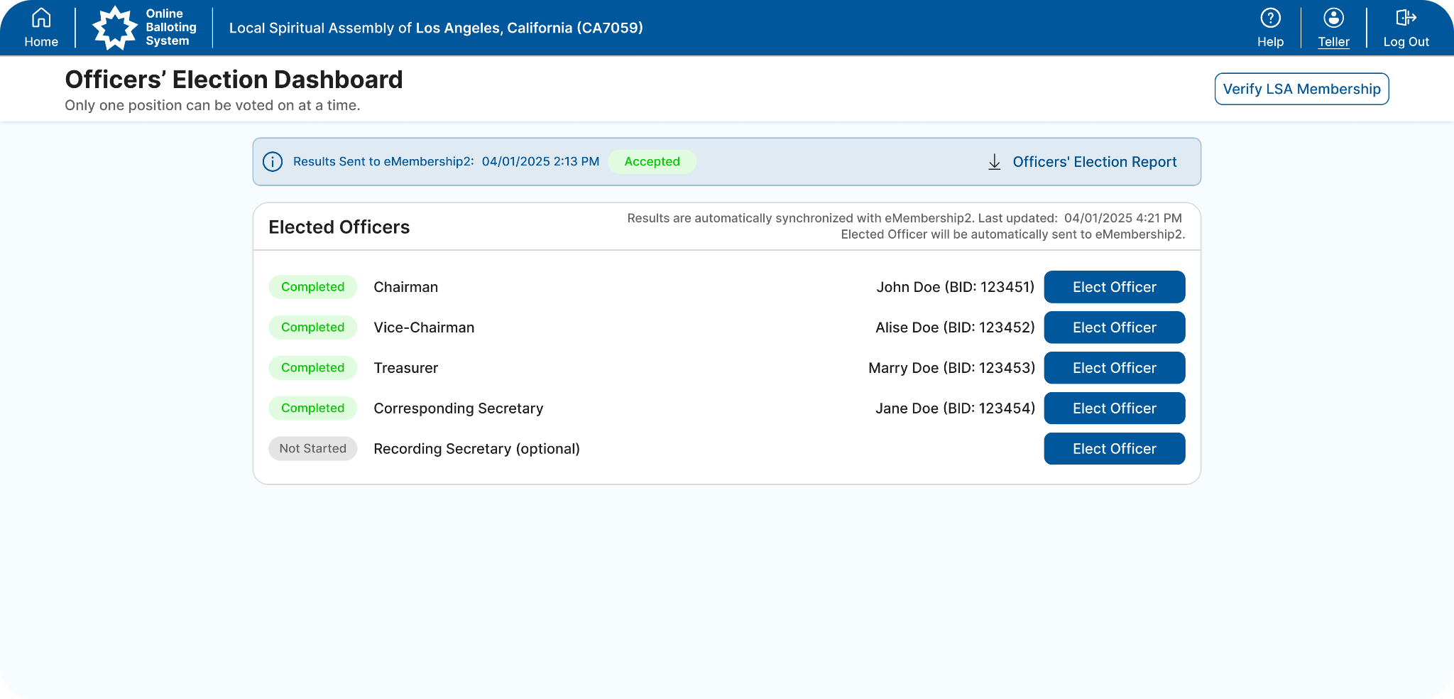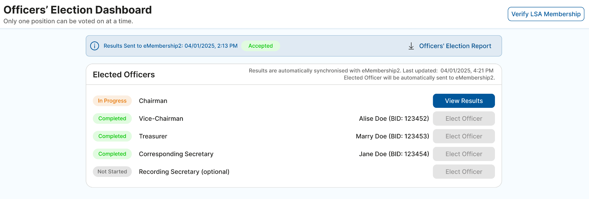 IMPORTANT: Results are automatically synchronized with eMembership2 after the position is confirmed. This can be observed on the Officers' Election Dashboard. Therefore, there is no need to report the results manually.