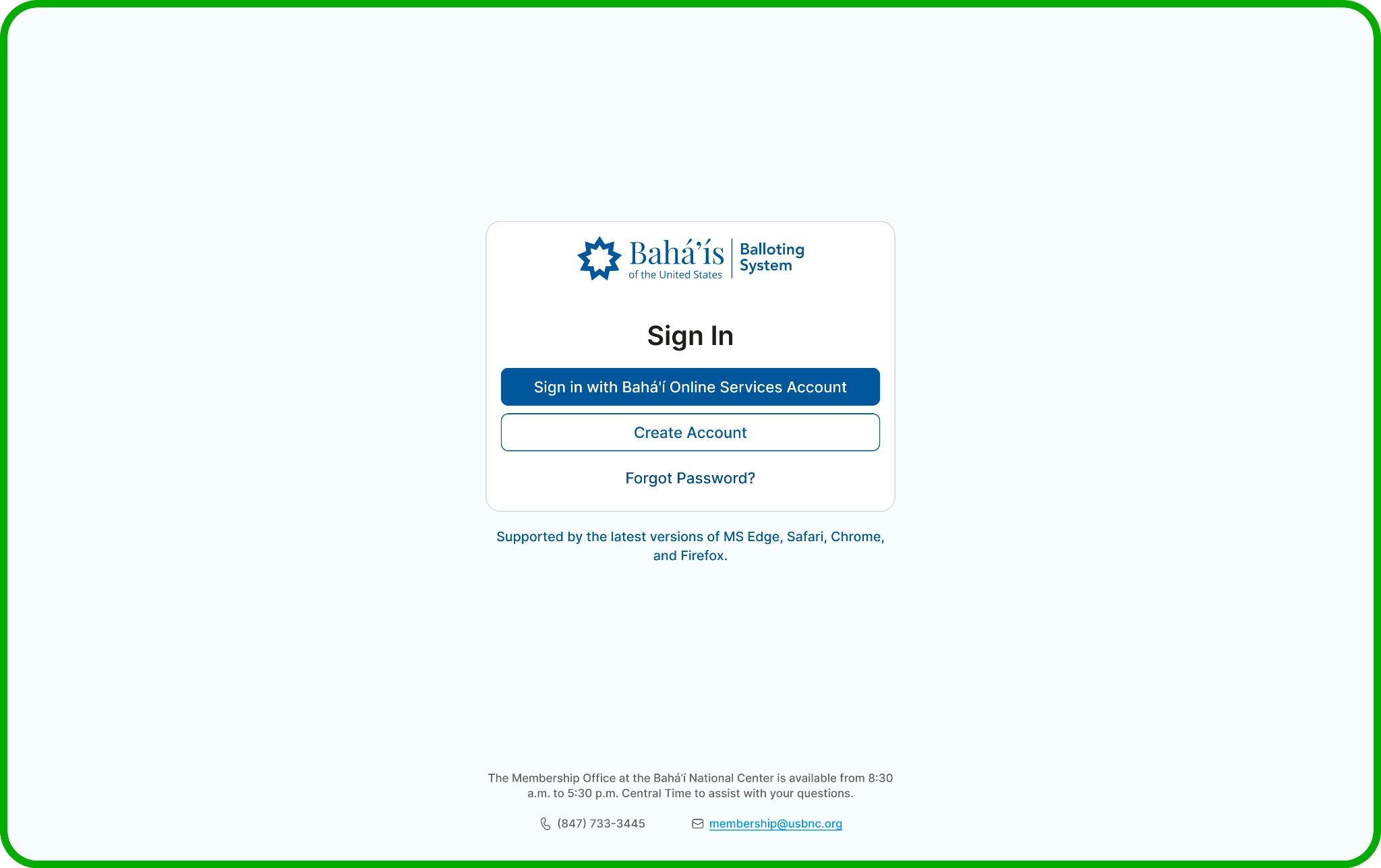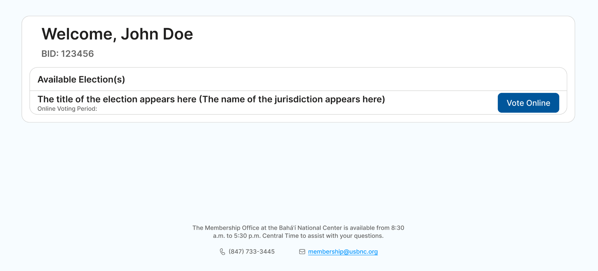 IMPORTANT: If there is no active online election or the online voting period is not open yet or has expired, you will see a message saying, “Sorry, no active election available.” If you believe there should be an active election, please contact your Local Spiritual Assembly’s secretary or call the Membership Office at the Bahá’í National Center at (847) 733-3445.