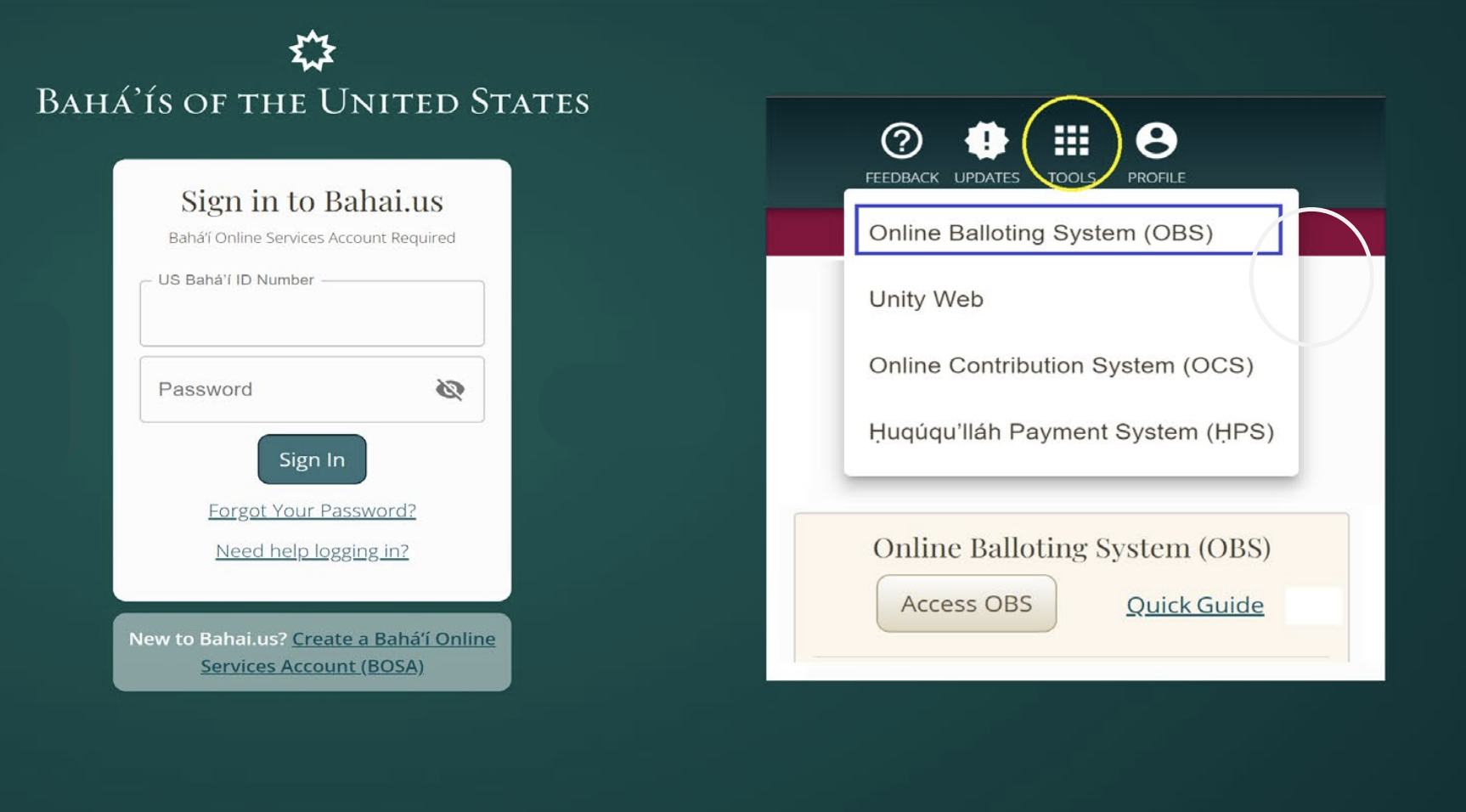 Visit the Bahai.us login page at https://www.bahai.us/community/login. Once logged in, click on “Access OBS”. OBS is also available under “TOOLS”.