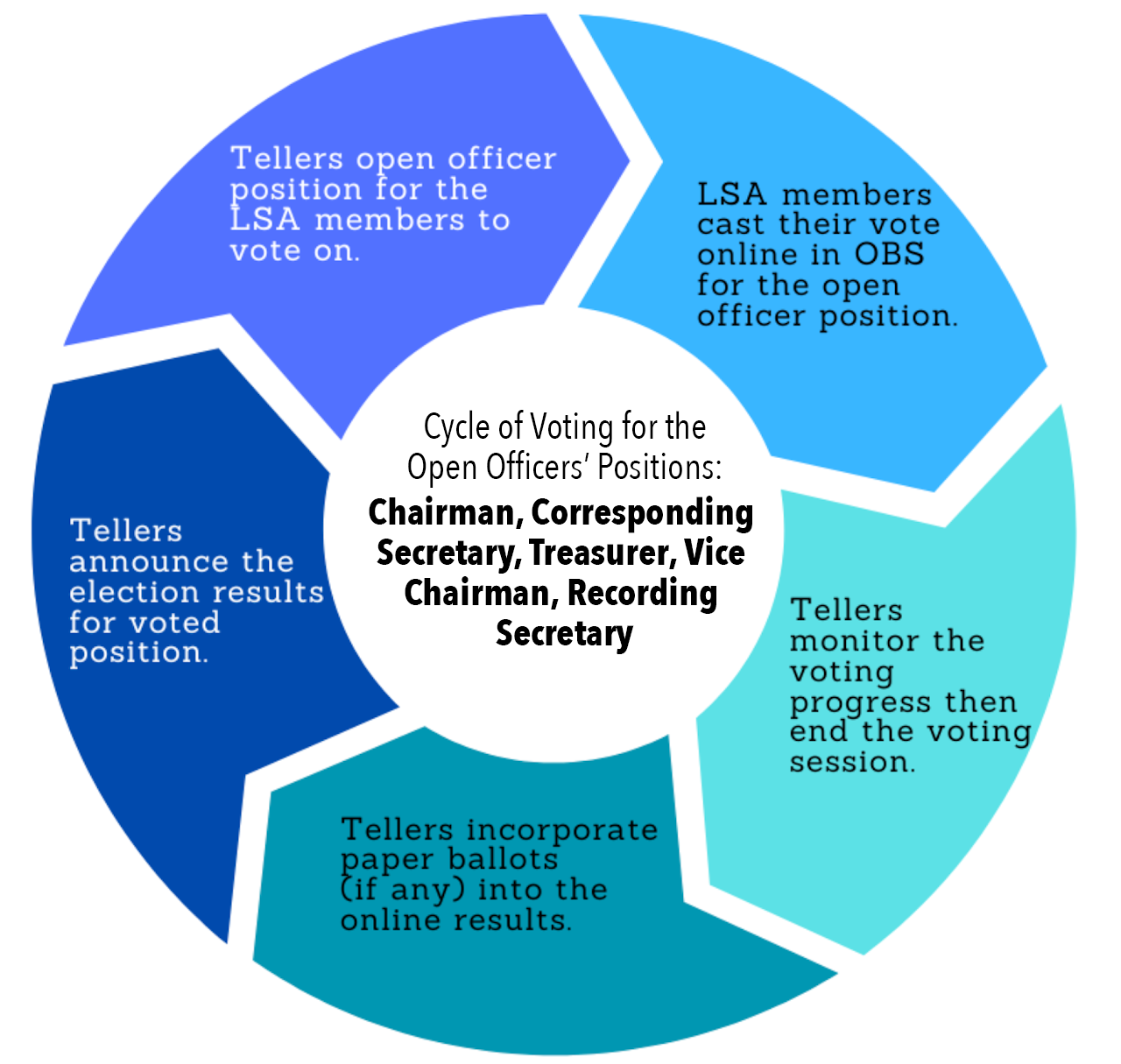 The LSA’s Temporary Contact logs into OBS and sets up tellers by entering the names of the two appointed LSA members. The tellers then log into OBS as a “Teller” for “Officers’ Election,” verify the LSA membership roster, and make corrections if needed.