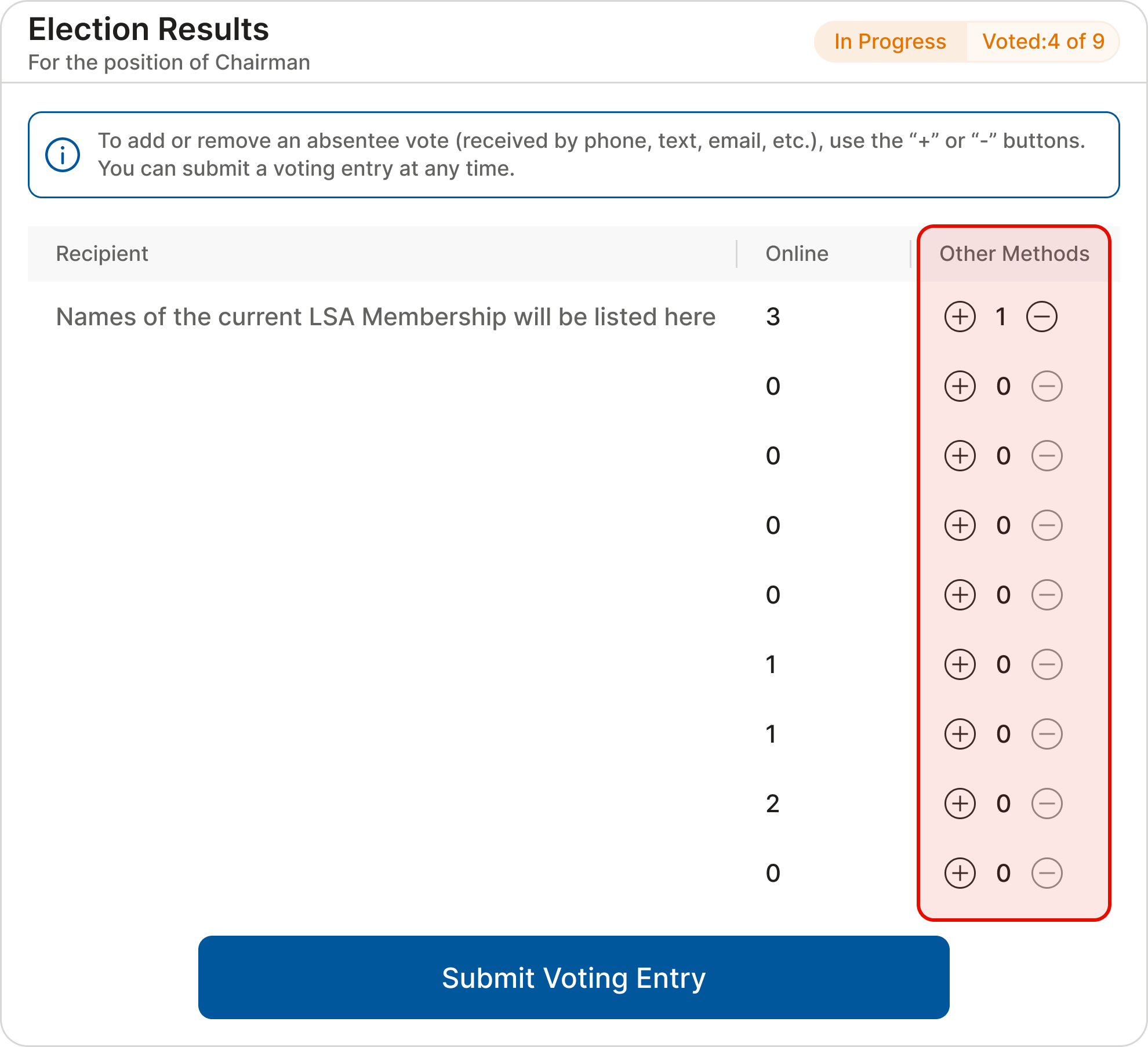 Votes from physical ballots can be added in the column “Other Method” using the “+” button. If a vote is added by mistake, use the “-” button to remove it.