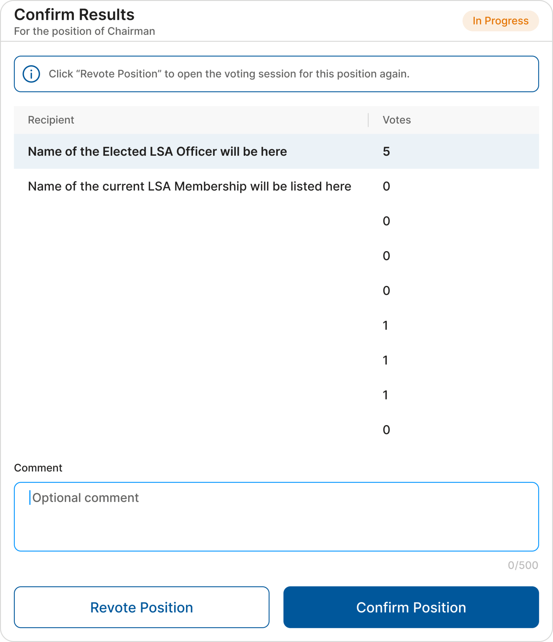 As soon as the position is confirmed, the status will be changed to “Completed” and the result will appear on the main dashboard. A position can be revoted at any time by clicking the corresponding button on the Officers’ Election Dashboard.