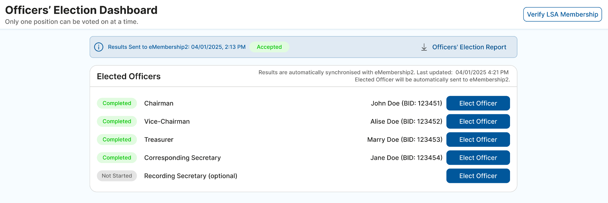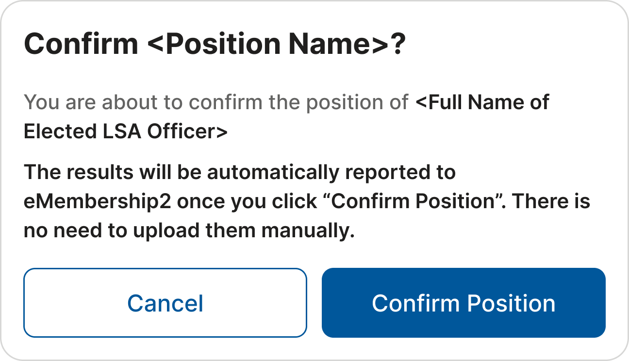 IMPORTANT: Results are automatically synchronized with eMembership2 after the position is confirmed. This can be observed on the Officers' Election Dashboard. Therefore, there is no need to report the results manually.