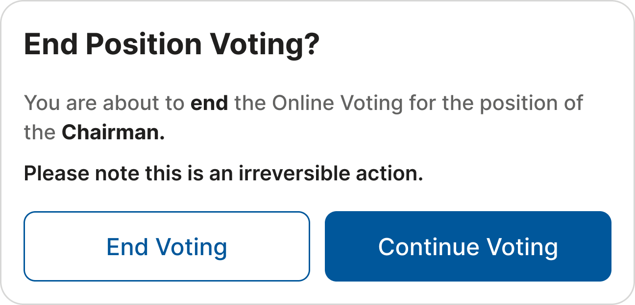 The tellers can stop online voting (a voting session) at any time. Once stopped, they can add/enter any physical ballots that may have been submitted by one or more Assembly members who did not participate in the officer’s election online. To start adding votes from physical ballots, wait until all the online participants have finished voting, then click “End Voting.”