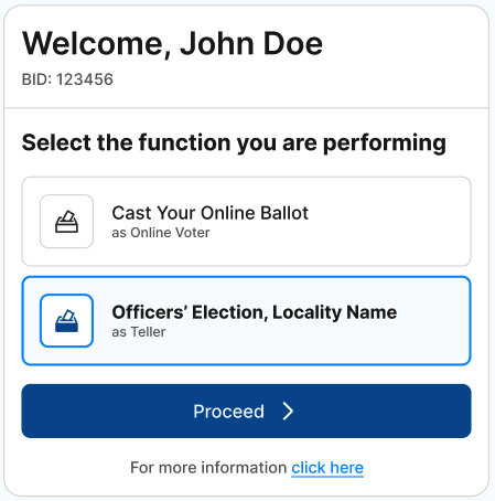 To access the Officers’ Election, once logged into OBS select the role of “Officers’ Election … as Teller.”